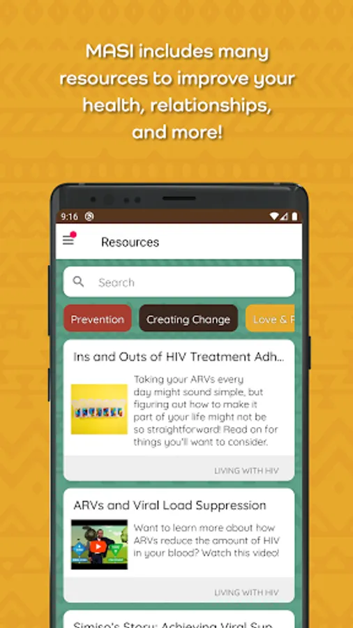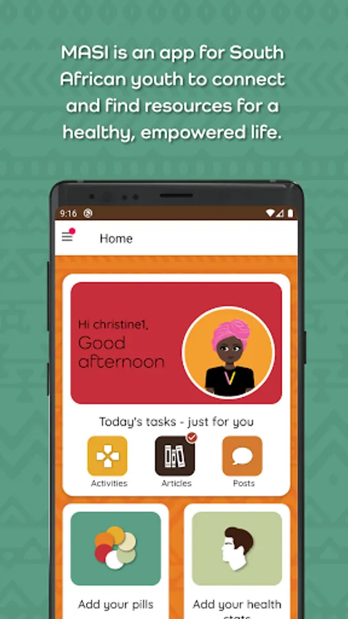 MASI is a research study app for South African adolescents that is designed to foster connections to a supportive community, offer tools for self-monitoring and habit formation, provide resources for goal-setting and action planning, and present engaging informational resources. MASI covers a range of health and wellness topics to support adolescents’ varying needs over time.