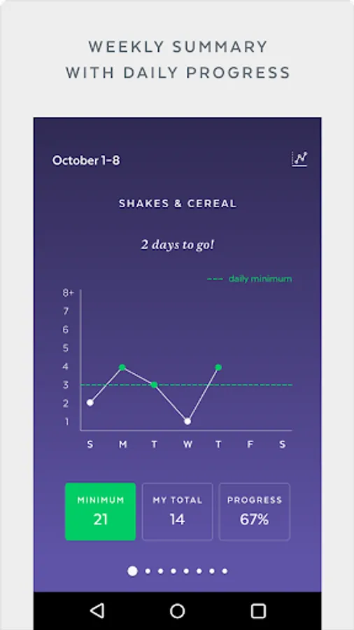 • Detailed data visualization: Learn to become a better self-manager through clear day-to-day plotting of key health behaviors against the program minimums. If your numbers in a behavior fall more days under than at or above the program minimum green line, your next step is clear: go for the green line every day (by doing higher numbers of that behavior) to improve success.