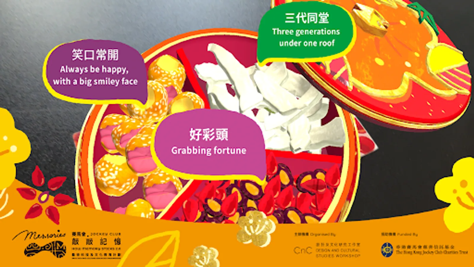 Full Box AR is an interactive application developed by the "Jockey Club "Knocking Memories" Art Technology and Cultural Education Project" donated by the Hong Kong Jockey Club Charities Trust and organized by the Design and Cultural Research Studio. Through Augmented Reality (AR) The technology allows the public to reveal the auspicious meaning animations in the various New Year foods in the whole box in an easy and friendly way, and can even take photos as electronic greeting cards to share with relatives and friends.