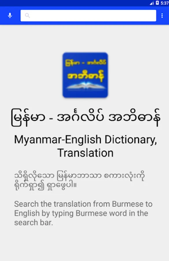It's very useful app for easy and fast translations, which can be used like a dictionary. If you are a student, tourist or traveler, it will helps you to learn the language. Burmese (also known as Myanmar language) is the official language of Burma (officially known as Republic of the Union of Myanmar).