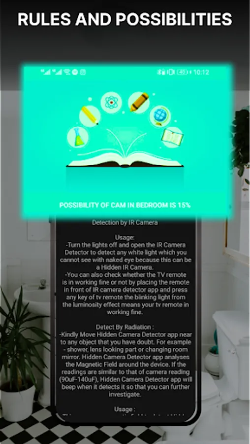 Hidden camera detector protects you from a spy camera. Hidden camera detector – Spy camera detector is a great app for people who value their privacy. If you are going out of the city and you want to stay at a hotel with family so for your privacy you need this free hidden camera detection and best hidden device detector & Spy camera detector app through which you can discover any spy camera. Use your smartphone and Detect hidden camera finder and spy hidden camera locator application and bring it close to any device that you have a doubt on.