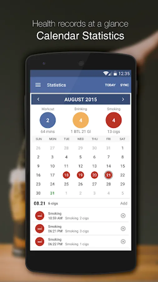 Input your daily activities into the app, then check your health status by looking at the the number of workouts, and the number of drinks you had last week.