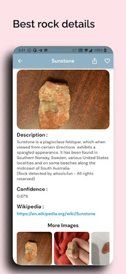 Simply take a photo (or upload) of a rock and Rock Identifier will tell you all about it in seconds. Explore your geological surroundings, learn about different rocks, and engage with the natural world with Rock & Crystal Identifier !