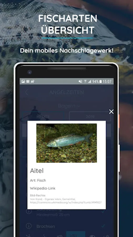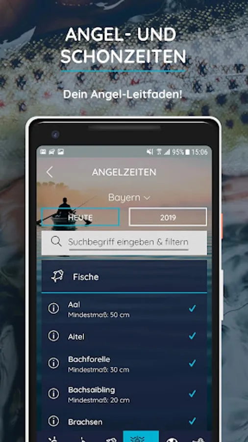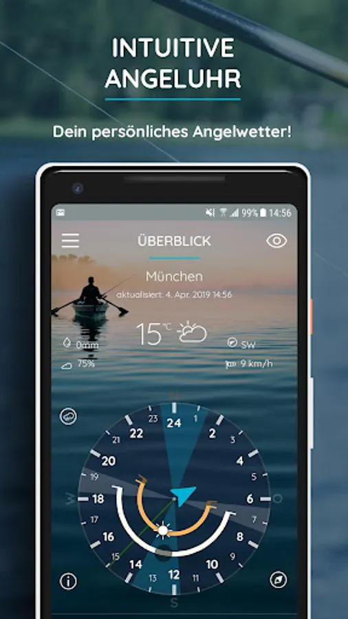 In der Angelwetter-App findest du neben Informationen zu Wetter, Luftdruck und Wind für Dein Angelwetter-Revier, ebenso Daten über Mondphasen, Mondhelligkeit sowie Angelzeiten und Schonzeiten.