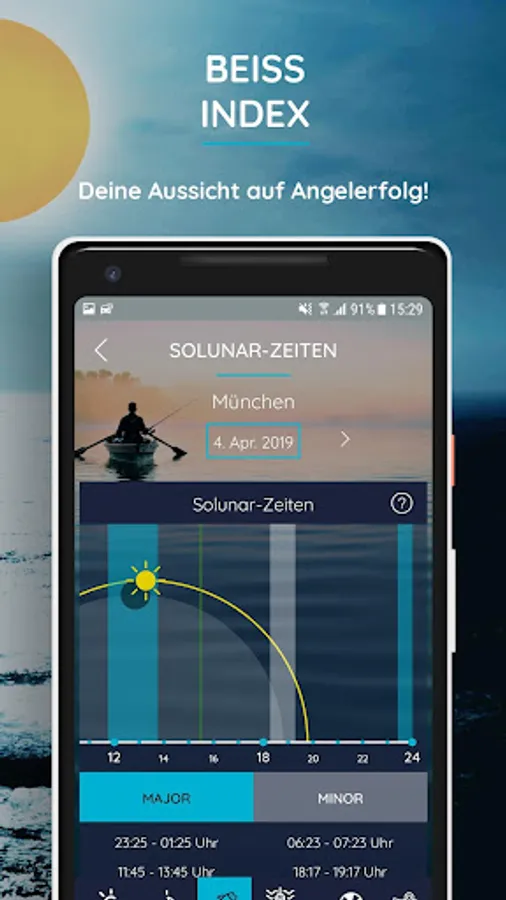 - Informationen über den Beissindex bzw. Solunar-Daten mit Angel-Erfolgswahrscheinlichkeiten für den aktuellen Tag oder für die Zukunft
