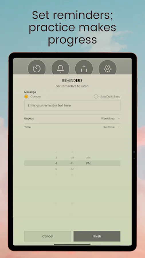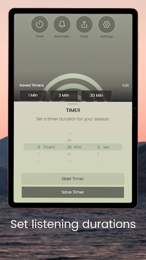 TIMERS and REMINDERS | Solu ToneStream lets you create and save favorite listening durations. You can also set reminders to listen at specific times, or be surprised with a reminder that appears at random within a time window you set.