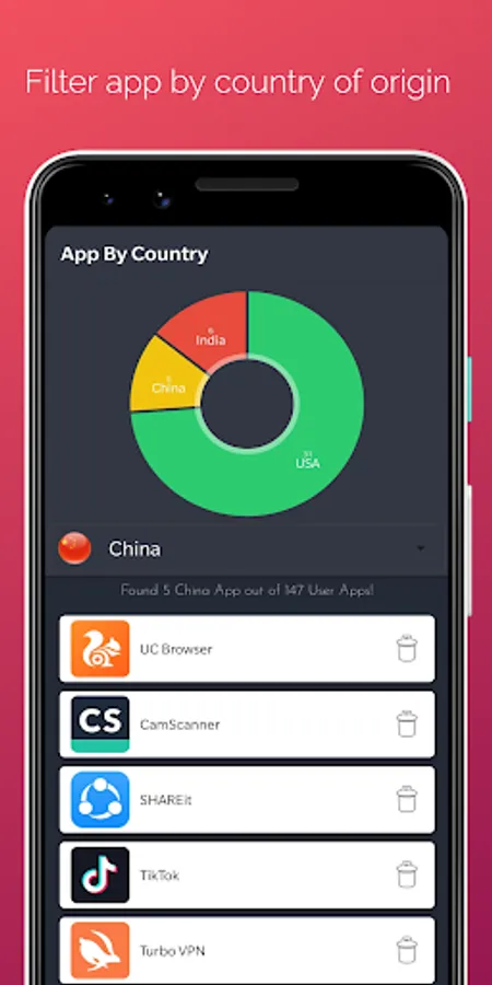 Disclaimer: This app does not incentives users into remove/Uninstall or disable third-party apps or modify the device settings. This app only filters the user application based on their country of origin. Identifying the origin of the app depends on available research, however, we don't ensure for any right/wrong data.