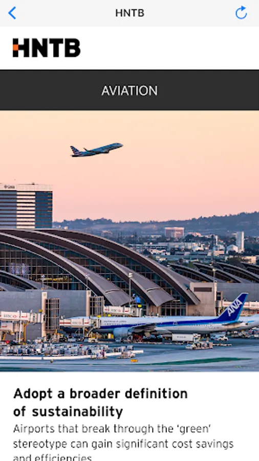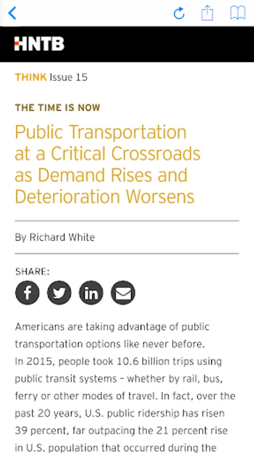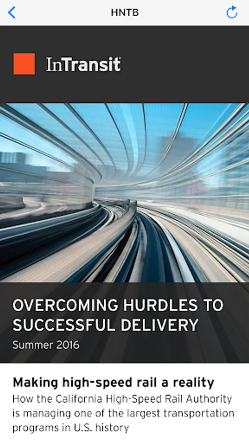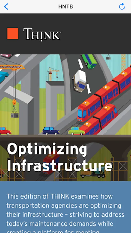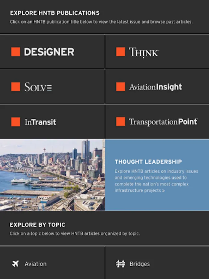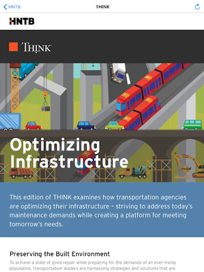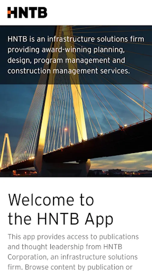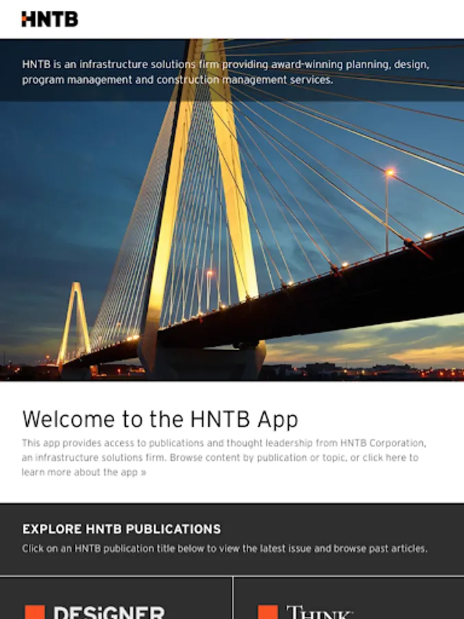 The HNTB app offers on-the-go access to a wide range of editorial, photography and other content highlighting HNTB’s expertise in helping clients deliver infrastructure solutions. Content covers all topics from broad infrastructure issues and thought leadership to case studies and content organized by specific markets. Content in the HNTB app is article-based and categorized by market for quick and easy access to a wide range of information. Users can share articles through email or social media platforms.