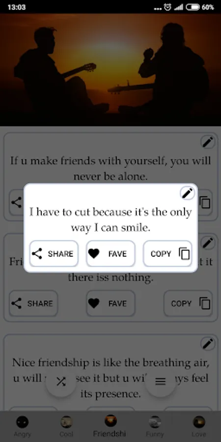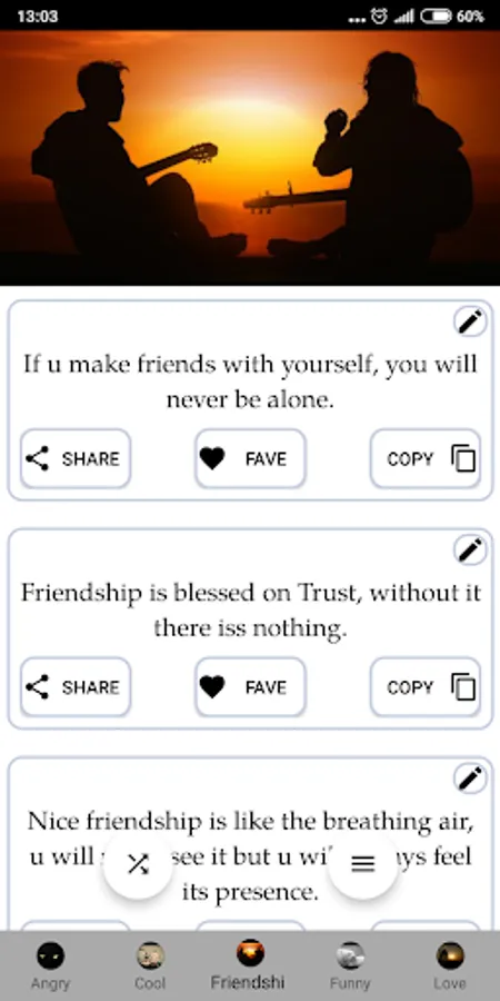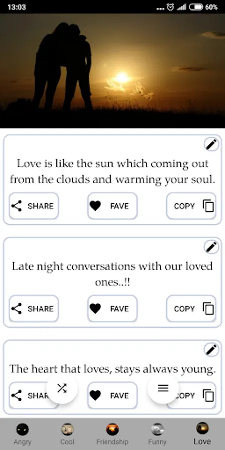 Edit: Easily change a quote, status, or quotation to save to your favorites as well as share to social networks like facebook, zalo, sms, ...