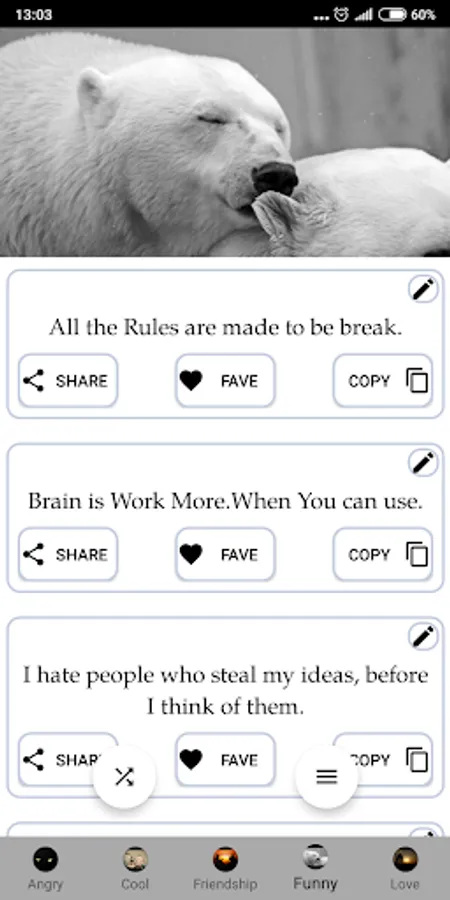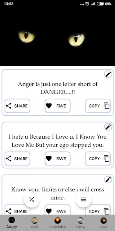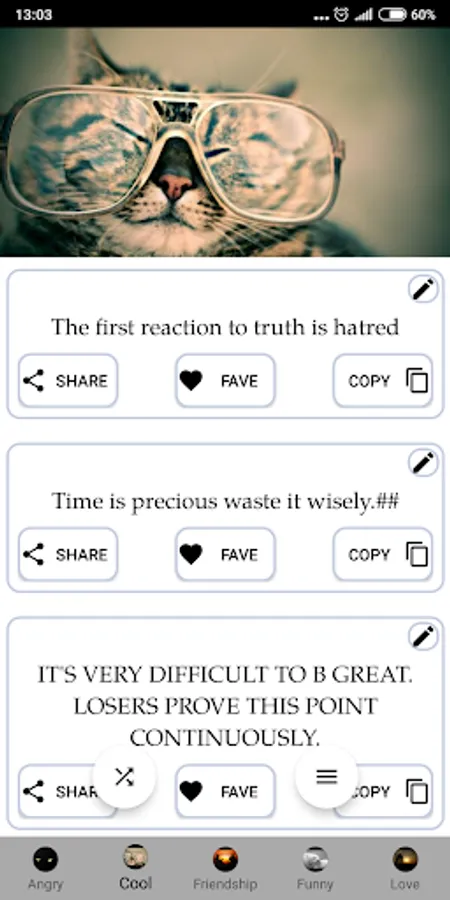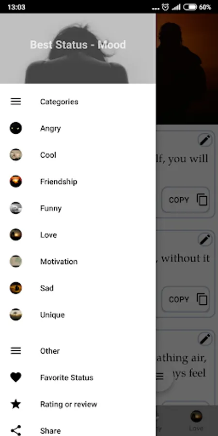 Copy : Easily touch a quote, status to copy and paste, edit them easily for sharing on social networks like facebook, zalo, sms, ....