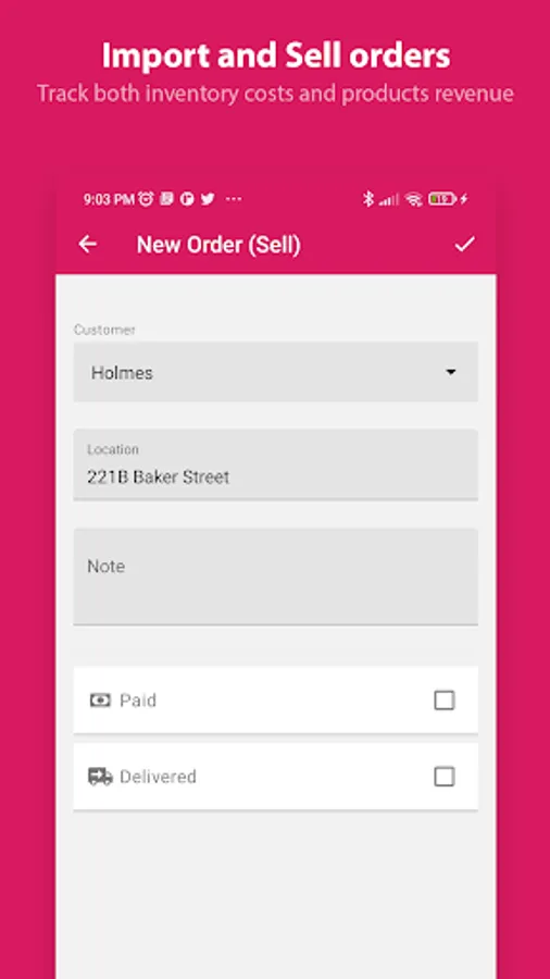 - Import and sell orders: Use Import order to keep track of Stock and Cost and Sell order to keep track of revenue