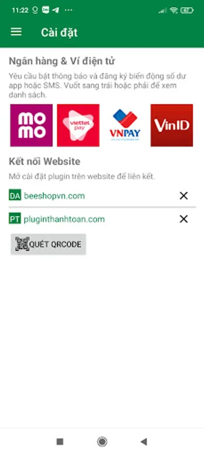 • Support for MOMO, ViettelPay, VNPay, Vietcombank, Vietinbank, Techcombank, MB, ACB, VPBank, BIDV, TPBank, HDBank, Agribank, VIB, Sacombank, OCB, MSB, SHB, SCB, ABBank, BAC A Bank, Eximbank, Nam A Bank, NCB, SeABank, LienVietPostBank, Viet Capital Bank, Timo, Cake, TNEX..