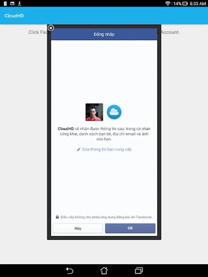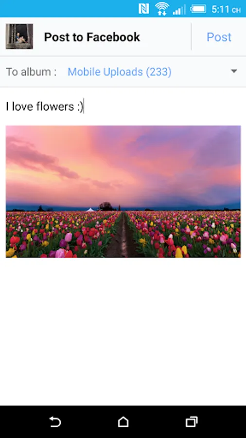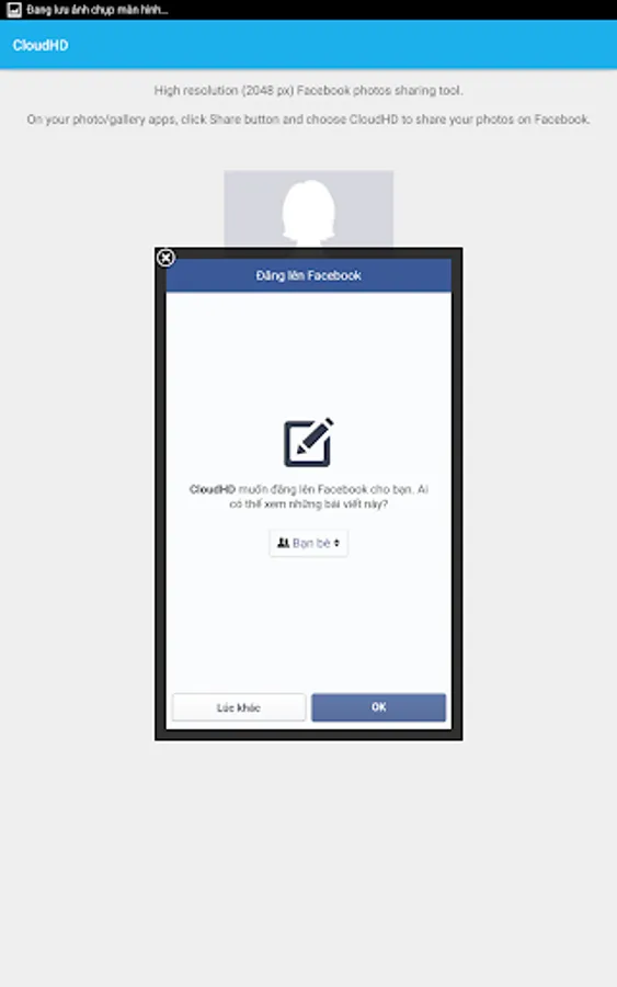 After connecting app with your Facebook account, simply choose one or more photos from your Gallery and use Share button then choose CloudHD to upload your photos. Your photos will be uploaded to Facebook in Maximum resolution which Facebook can store (2048px).