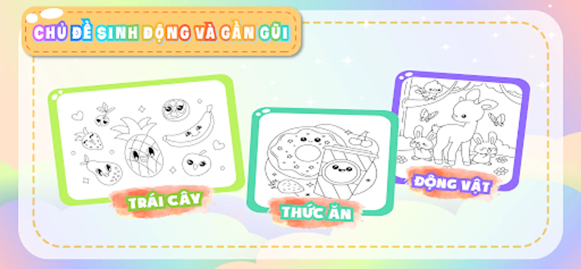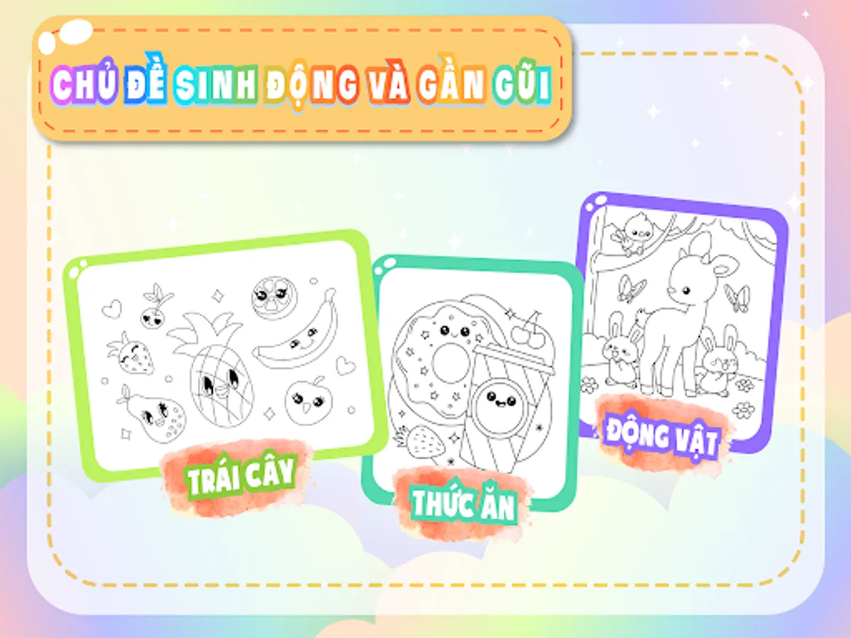 During the coloring process, children will be enhanced their understanding of new knowledge with diverse topics in life such as animals, plants, vehicles, food, fruits, toys, .. Through it, the baby also recognizes the shape and the world around the thing that he is discovering.