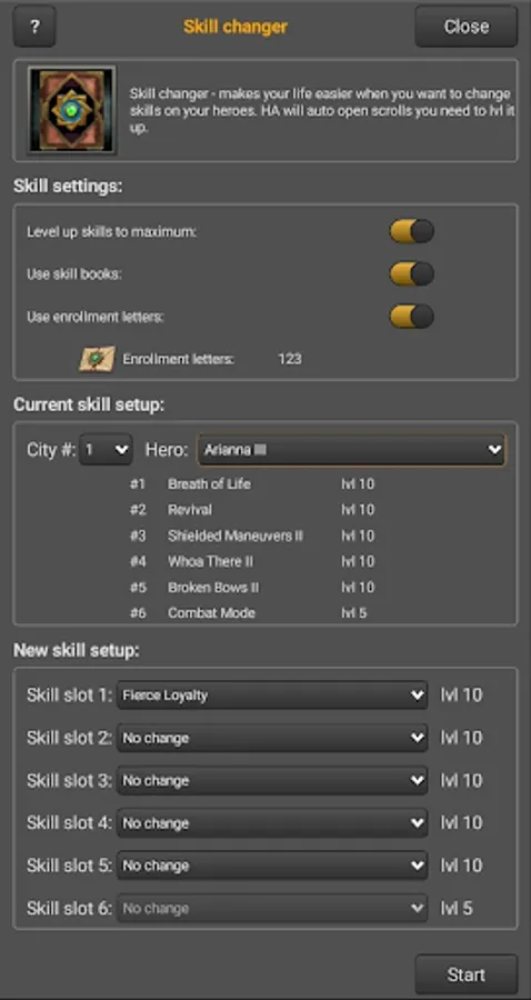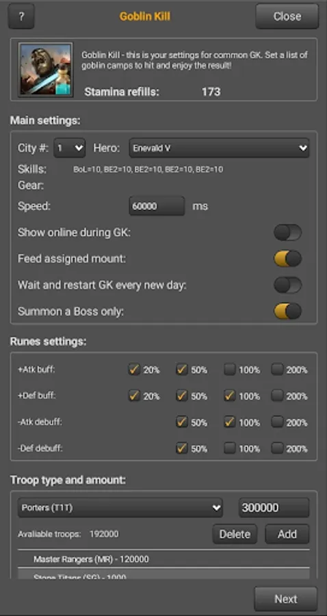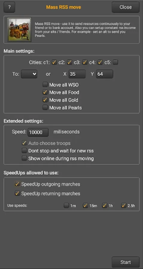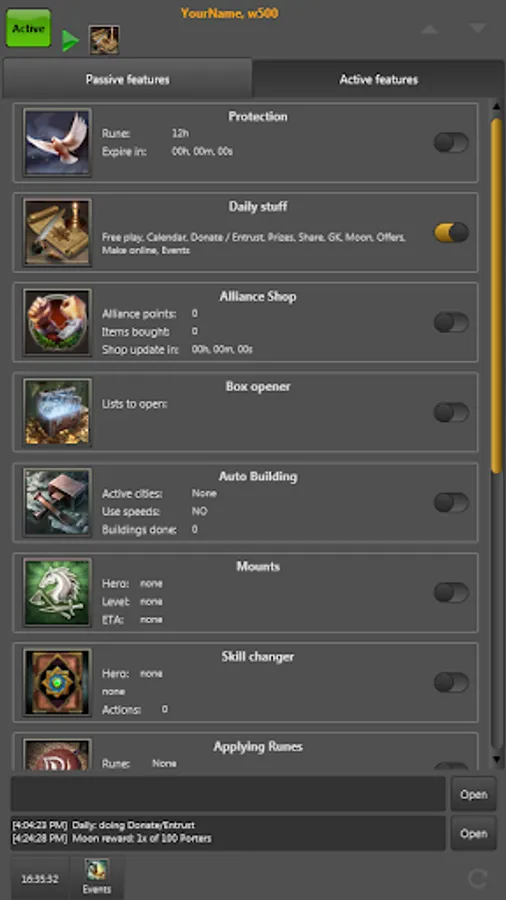 GK, EGK, SGK, BK, EBK, CHS, ECHS, SCHS, Mining, Wheel, Premium, Building, Training troops, Training walls, Skill changer, Daily stuff, Reassign troops, Rss transfering, Box opener, Applying runes, Tower, Coord Finder and much more!