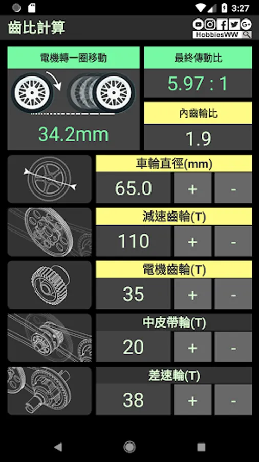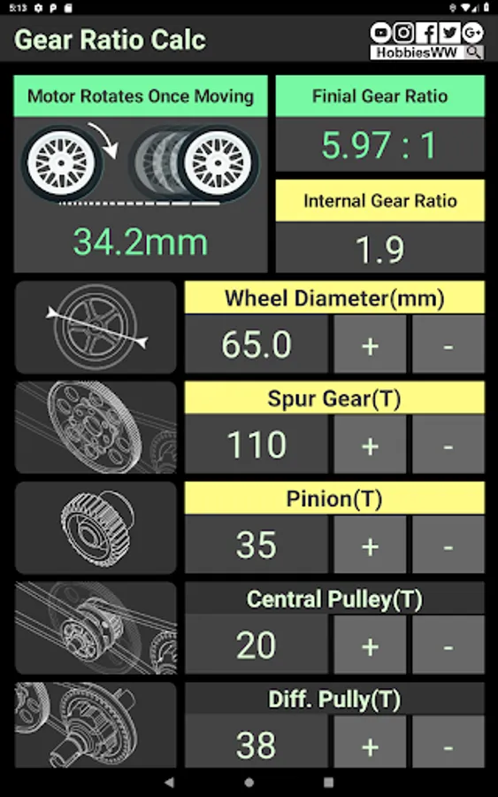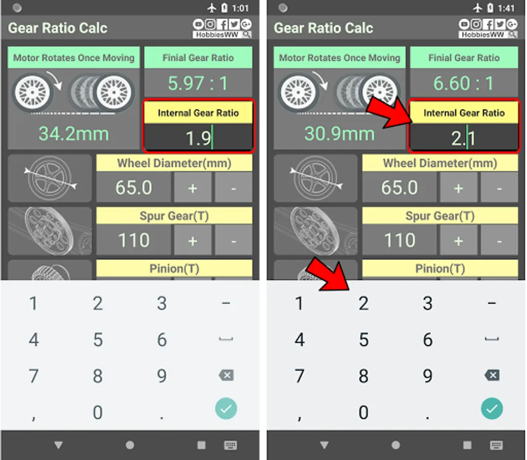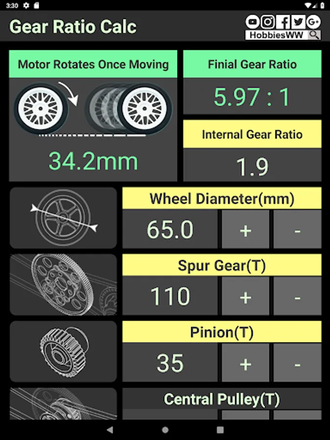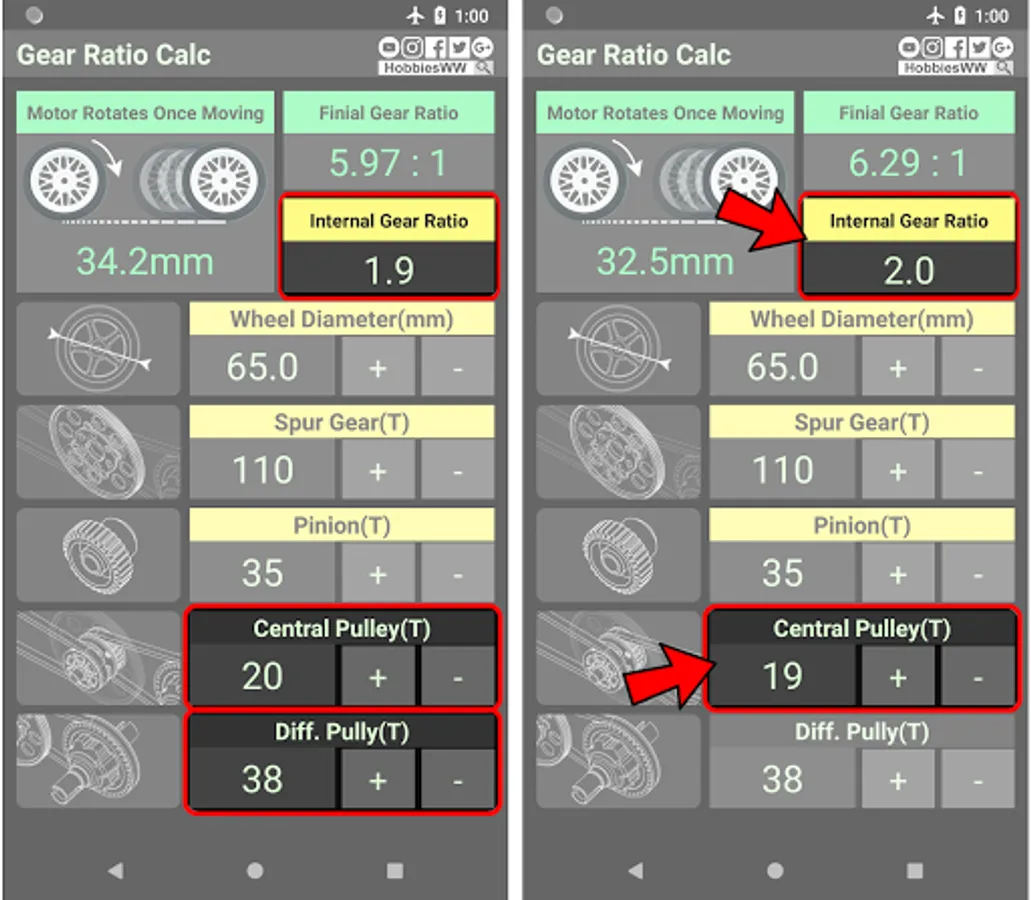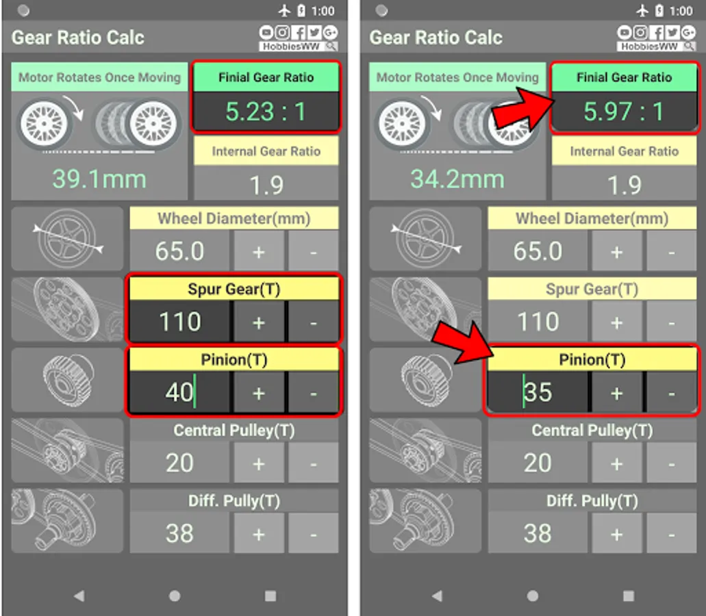 Calculation moving distance you can accurately set the gear ratio for different types vehicle(eg...Touring, M-Chassis, F-1, 1:12)