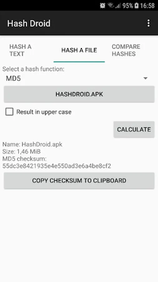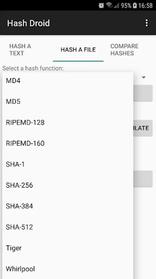 The second tab helps you to compute the hash of a file located on the internal or external memory of your device. The size of the file and the last date modified are also displayed.