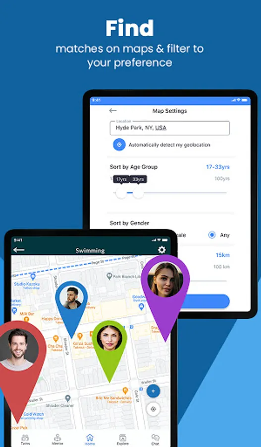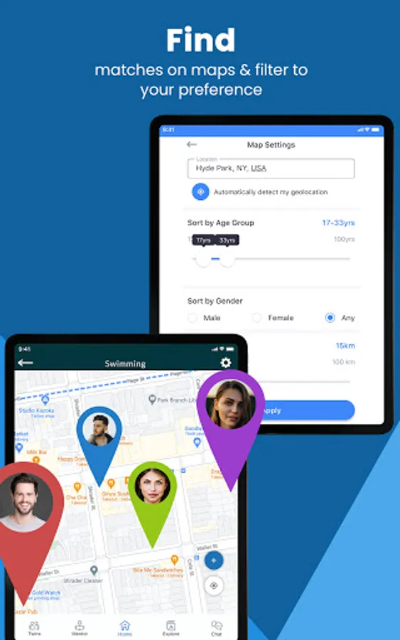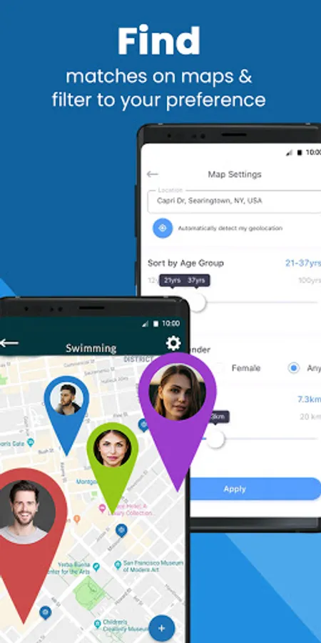 - Filter and sort matches by Distance, Location, Gender, and Age-group.