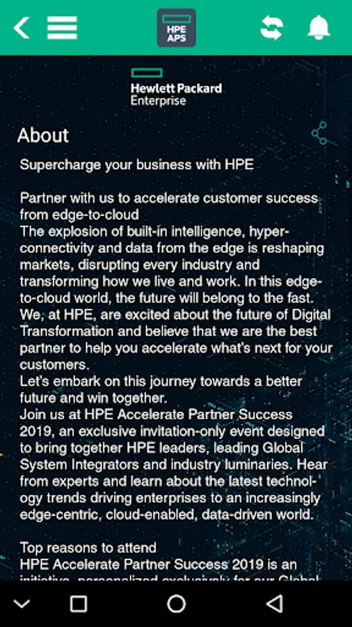 Stay tuned with all the latest updates on the HPE APS 2019 Mobile App. Simply login, engage with peers, rate your favourite sessions, access the event agenda and get the latest event updates, all at your fingertips.
