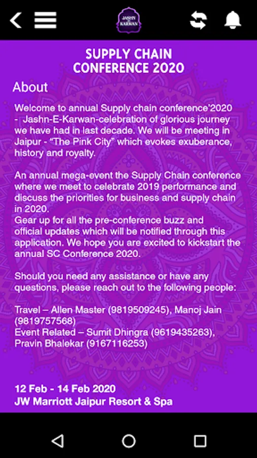 This app will help you stay connected pre event , during the event and post event. You will be able to see the check in details of hotel, live photos, get into conversations, participate in live polls.