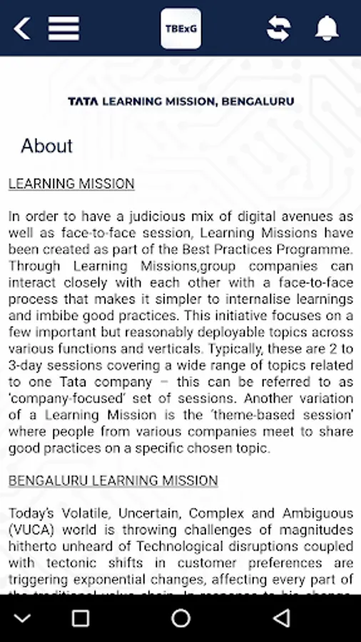 Thank you for tuning in to the TBExG App. This App will help you with the latest updates on the various Events, Programs and Learning Missions in real time.