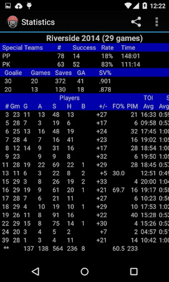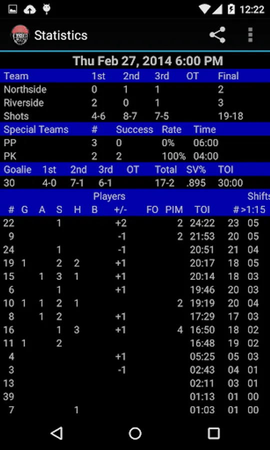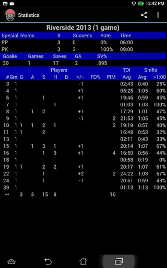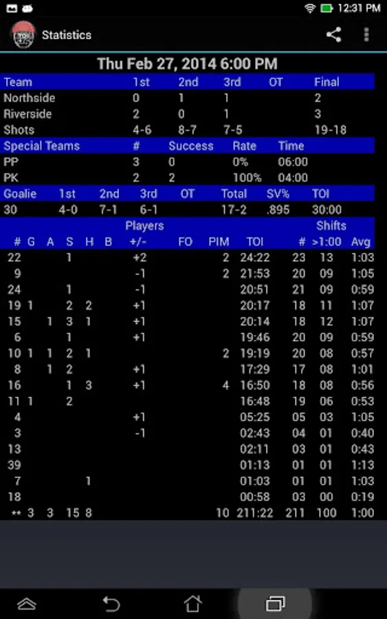 Please note that the app doesn't track the other team beyond keeping track of your goalie's saves and goals allowed. As a result, there are some things that Hockey Boxscore does not do: