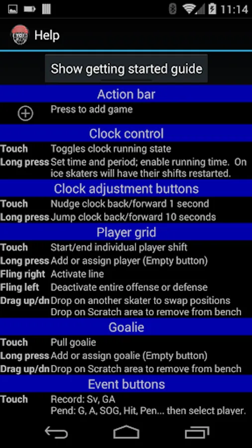Hockey Boxscore is designed to provide you with a high degree of control over how and when events are entered for your team. As the game progresses you can use the clock controls to keep the app in sync with the actual game clock, and use the player grid to track players starting and ending shifts. When your team does something (scores a goal, takes a penalty, etc...) you can use the event buttons to record the event and associate it with a player.