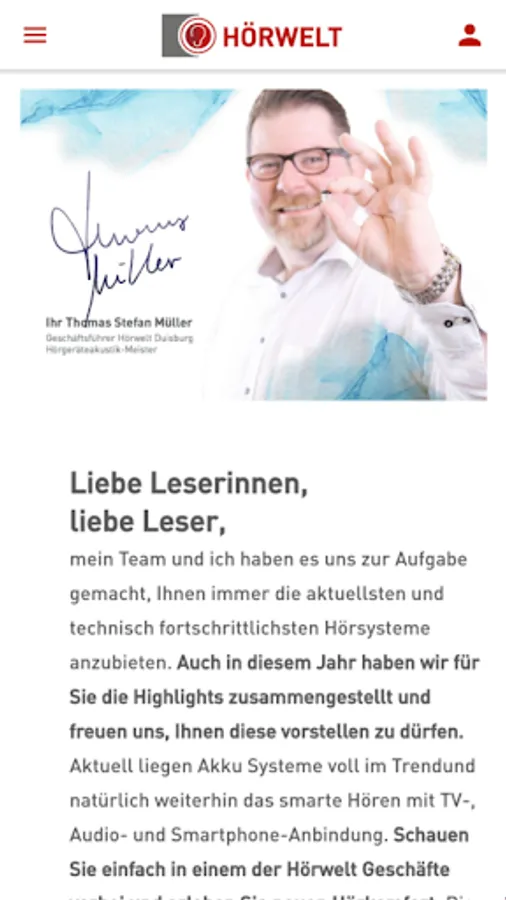 With our in-house APP, we, the team of Hörwelt Duisburg and Grafschafter Hörwelt, want to support and support you as our customer even better. Here you will find everything about hearing and better understanding. You will always be up to date, you will receive maintenance tips, event invitations, vouchers and much more. Create your own profile and benefit from many advantages around your hearing aid.