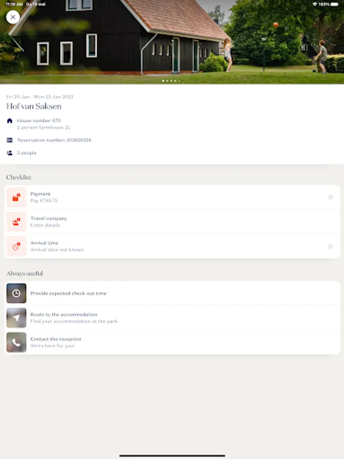 View all of your reservation's information in one place. Here you can see the booked accommodation, including everything that is present in your accommodation, which is very convenient! Simply use the app to add your remaining payment to your travel group. Using our simple booking overview, you can count down the days until your next stay.
