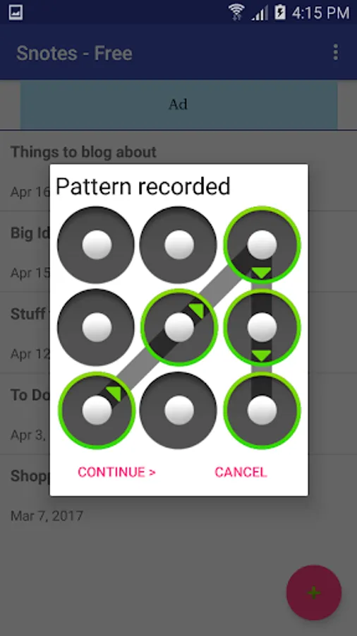 If somebody else picks up your phone and sees this app it will just look like a regular note-keeping app. But they are actually seeing a bunch of bogus notes. Draw any squiggle to make the unlock screen show. When you enter the correct unlock pattern the bogus notes are hidden and your real notes are displayed.