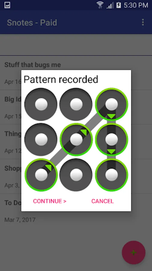 If somebody else picks up your phone and sees this app it will just look like a regular note-keeping app. But they are actually seeing a bunch of bogus notes. Draw any squiggle to make the unlock screen show. When you enter the correct unlock pattern the bogus notes are hidden and your real notes are displayed.