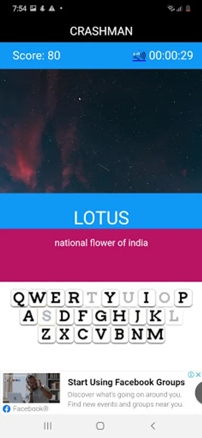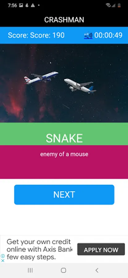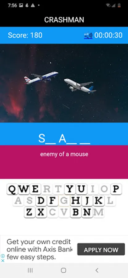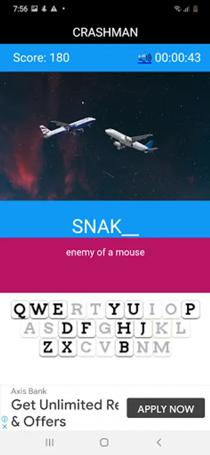 This is a word game where you guess letters of a word from the clue given. Every wrong guess will push two air crafts towards each other to crash! Keep guessing wrong and they crash.