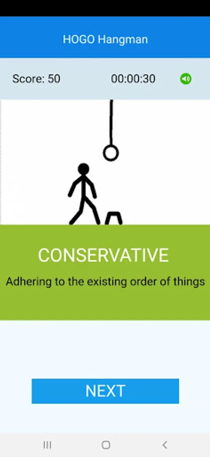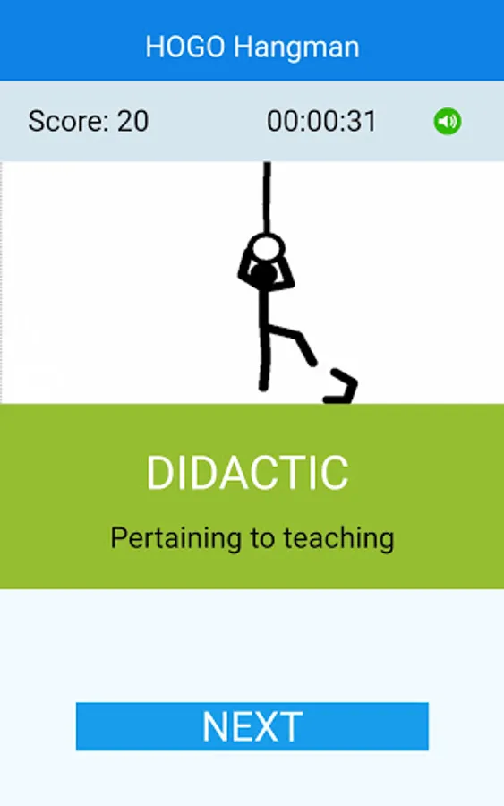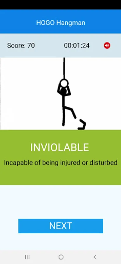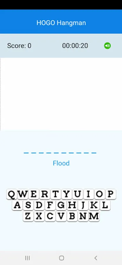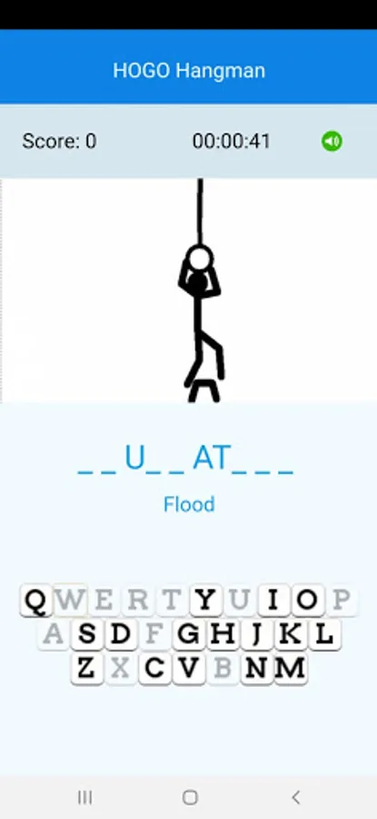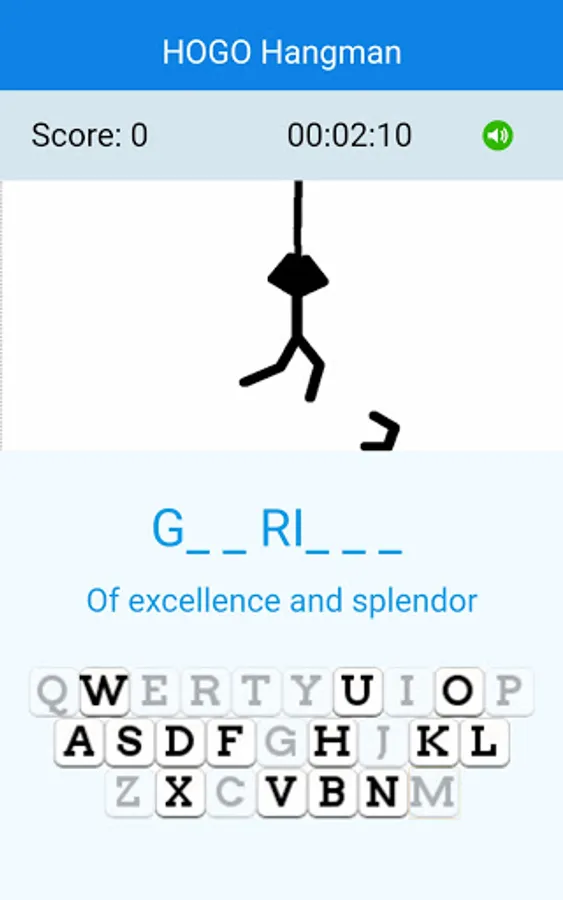 A word is given hidden within blanks: every letter is represented by an underscore. A hint is given below it – usually the meaning of the word. Your objective is to guess the word with the help of the hint. You shall do it by guessing single letters at a time. When you press a letter given in the keyboard, and if the word contains the letter, the underscore is replaced with the letter. If your guess is wrong, and if the word does not contain the letter, a silhouetted character tries to hang itself. Appropriate sounds are given to keep the game lively. You can mute or unmute the sounds with the speaker icon.