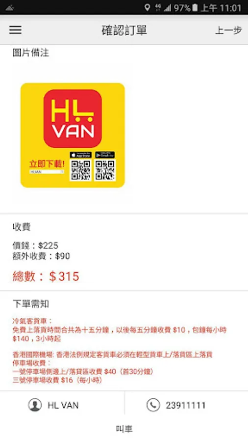開利客貨車,簡稱( HL VAN ),一個全新概念CALL車平台,專為客戶、司機度身訂造,簡易操作,全自動電腦配對柯打,一經確認資料,司機幾秒內回電,同時客戶亦可在手機上清楚看見司機資料,避免司機出現派單情況(確保服務質素),繁忙時間亦有訊息提示顧客等候情況,避免客戶在街上苦等,預算行程更輕鬆,完全合乎香港分秒必爭的活力,車隊均配備及採用GPS定位追蹤,運送過程及記錄一目瞭然,即時報價,即時定位,追蹤查詢簡易清晰,立即下載體驗前所未有的CALL車服務。