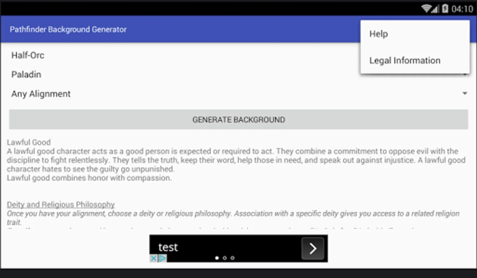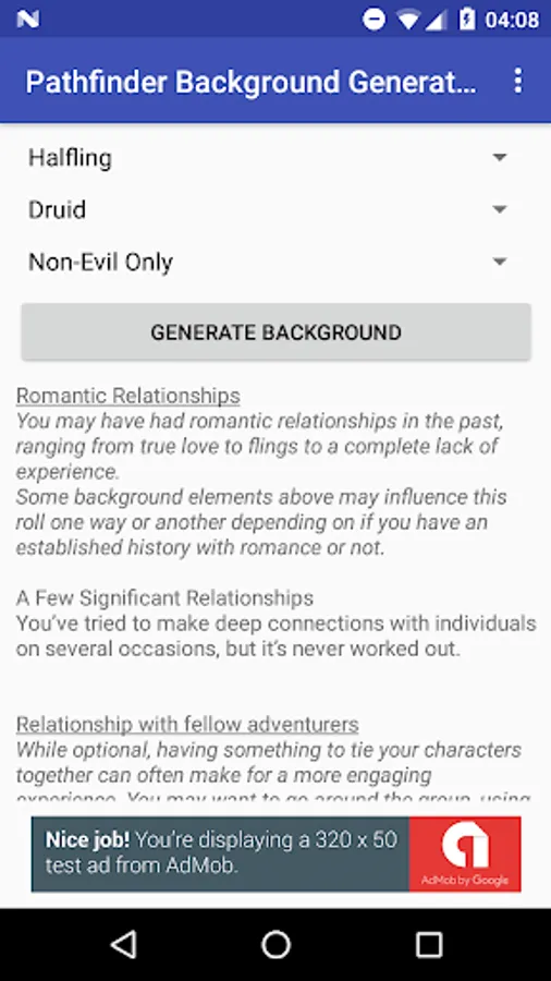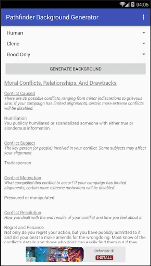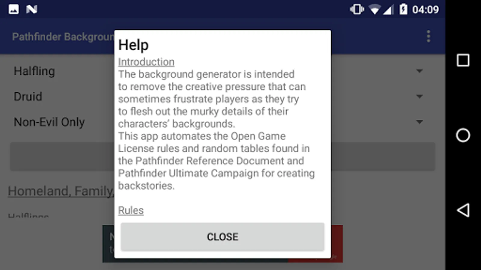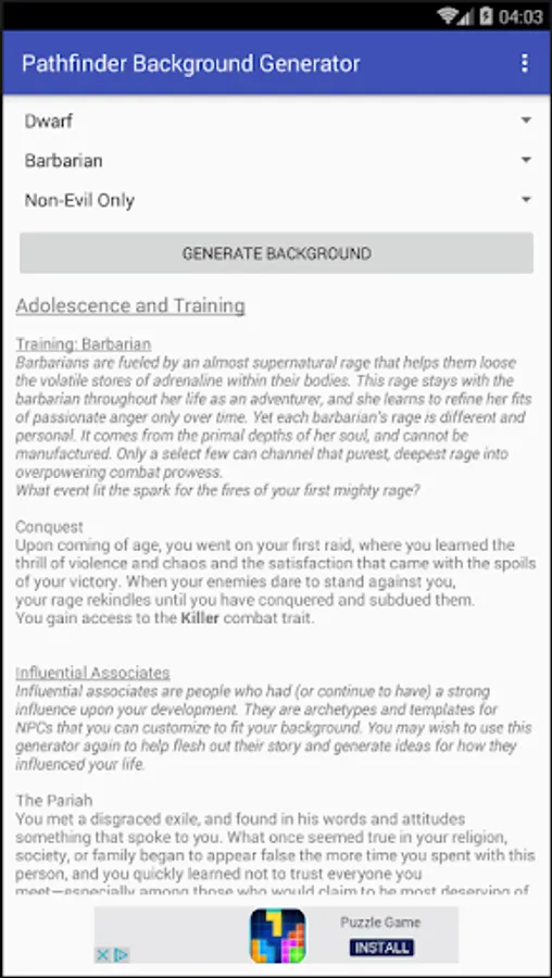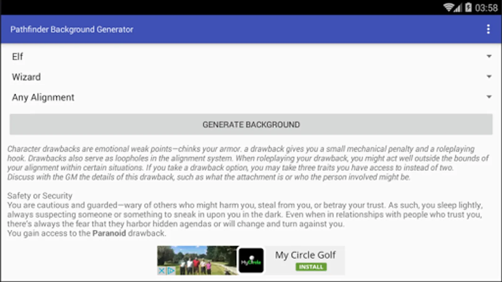 Struggling to come up with a backstory for your Pathfinder character? No more! One tap and you're set!