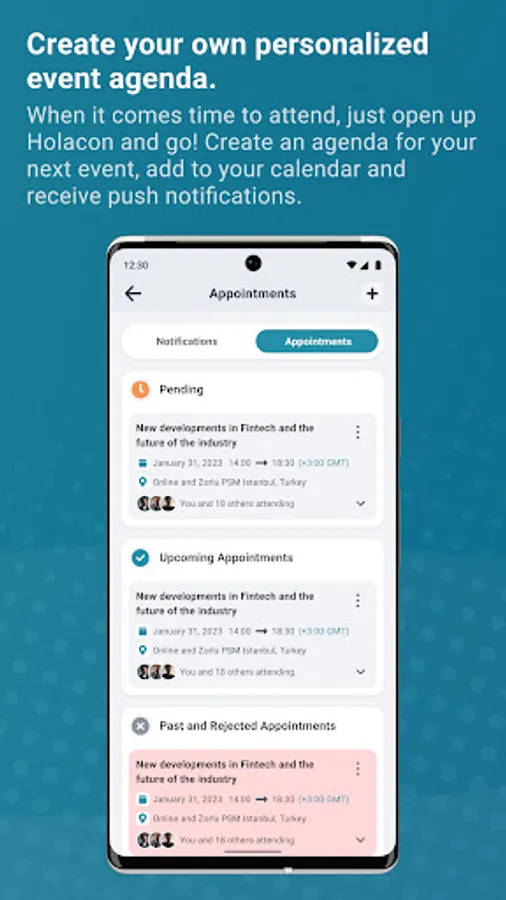 When it comes time to attend, just open up Holacon and go! Create an agenda for your next event, add to your calendar and receive push notifications