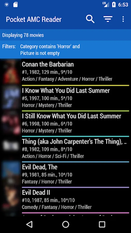 This application will allow you to read catalogs created by Ant Movie Catalog on your Android phone. It will read XML catalog and import it into its own database which is done for performance reasons. On each start the application will check size of the XML file and when it changes, database is updated. Depending on size of your catalog and speed of your phone, it might take several minutes to import all movies and to start up.