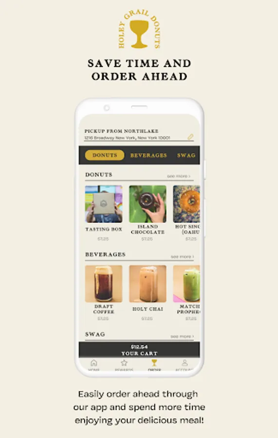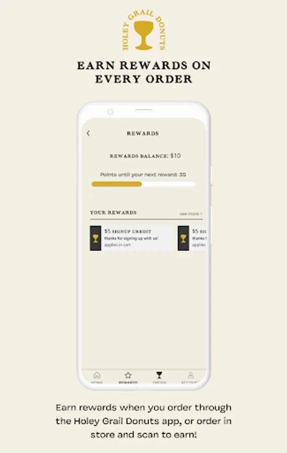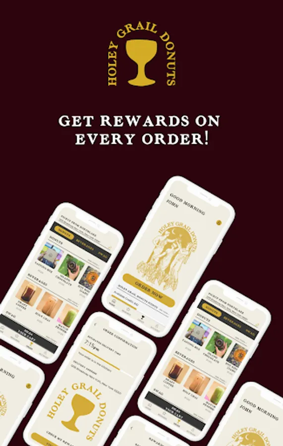 "The Holey Grail app is a convent way to order ahead and earn rewards! Rewards are built in so you'll earn ""Grails"" on every purchase towards free drink pairings and donuts. Skip the line through app ordering and claim free birthday donuts. We'll also make sure you're the first to know about our exclusive menu items and ""micro-lot"" flavors.