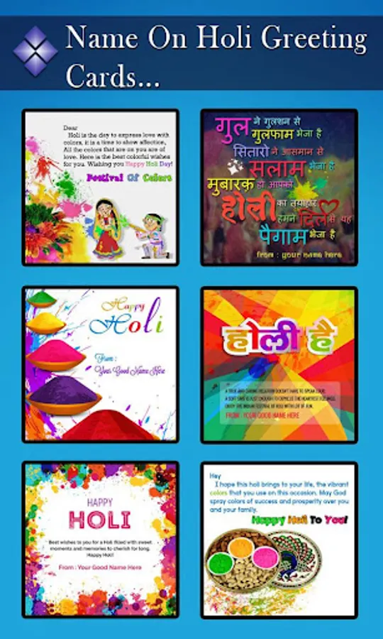 Generate cool Greeting Cards with your favorite name with Name On Holi Greeting Cards tool. You can choose Pics from a wide range of templates with cool fonts and designs. Now greet your friends with cards with your and their names.
