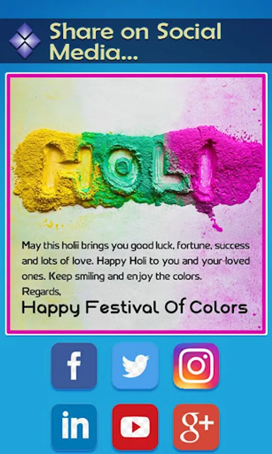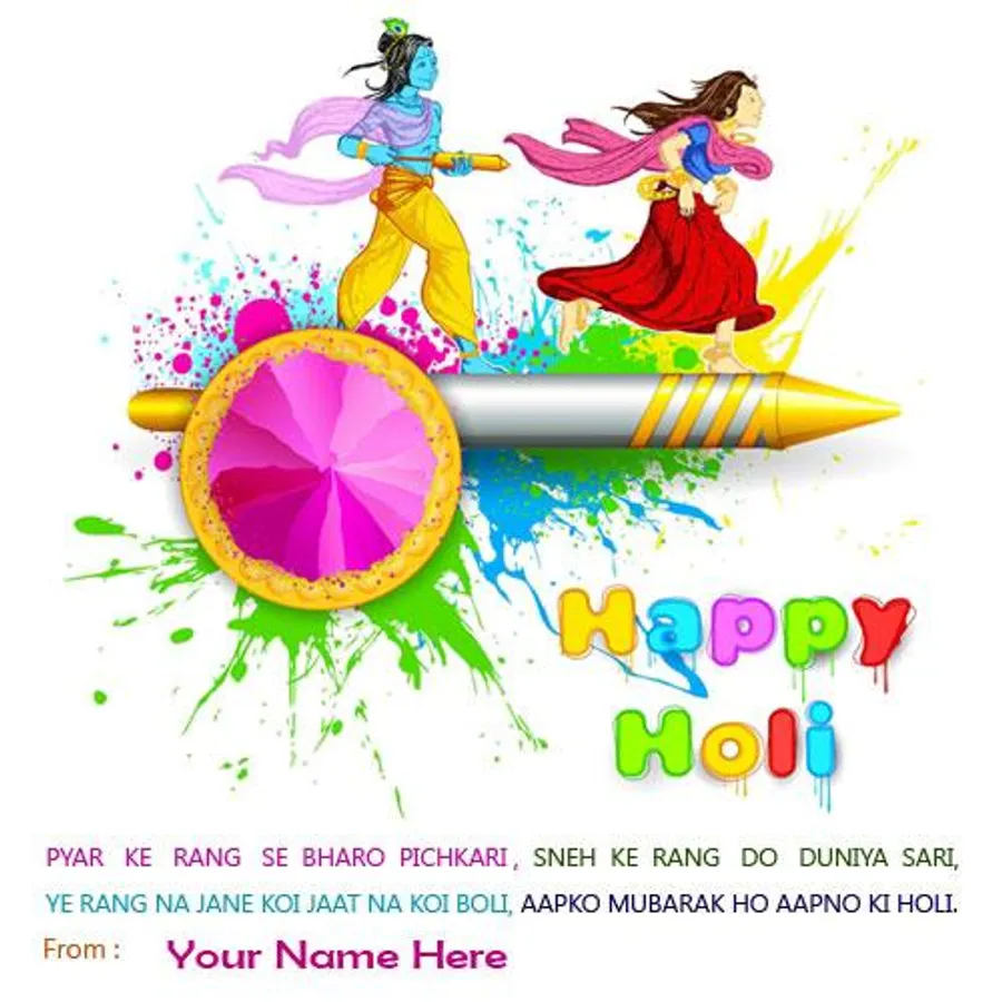 After creating (writing your name on greeting card photo) Holi Wishes Pics you will like and love it. Once you make the card after that you can download it as image or can be sent through e mail as pic and also you can share or post to Facebook, google plus, pinterest, twitter or celebrate the occasion with your friend and family members.