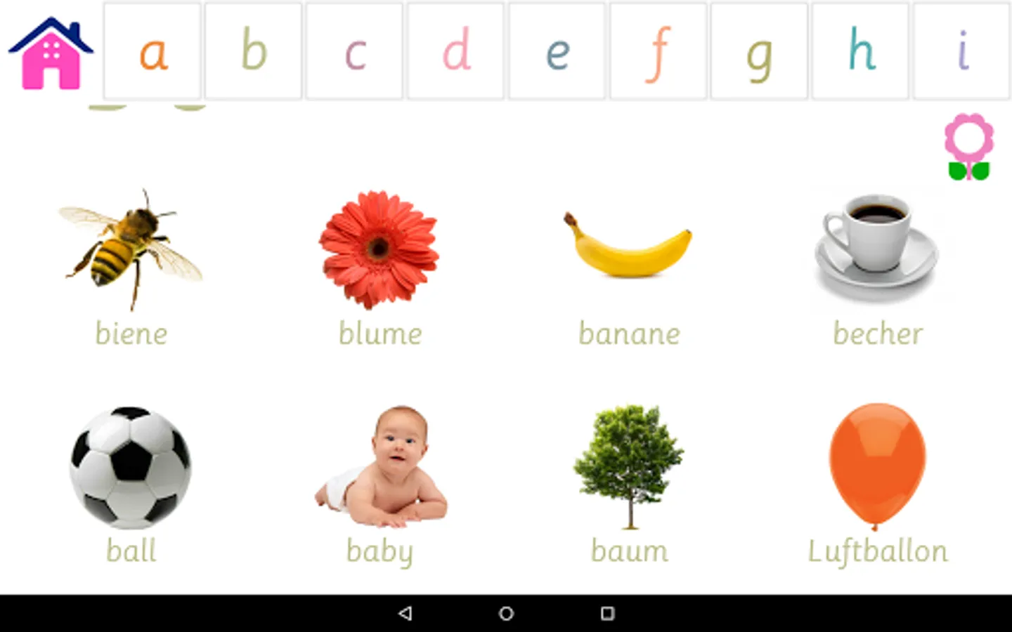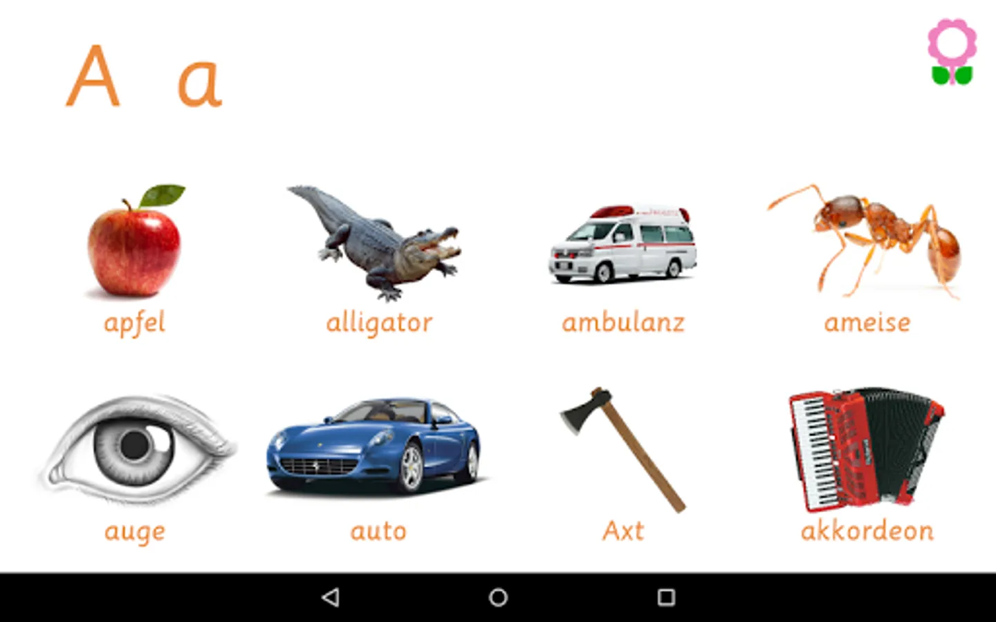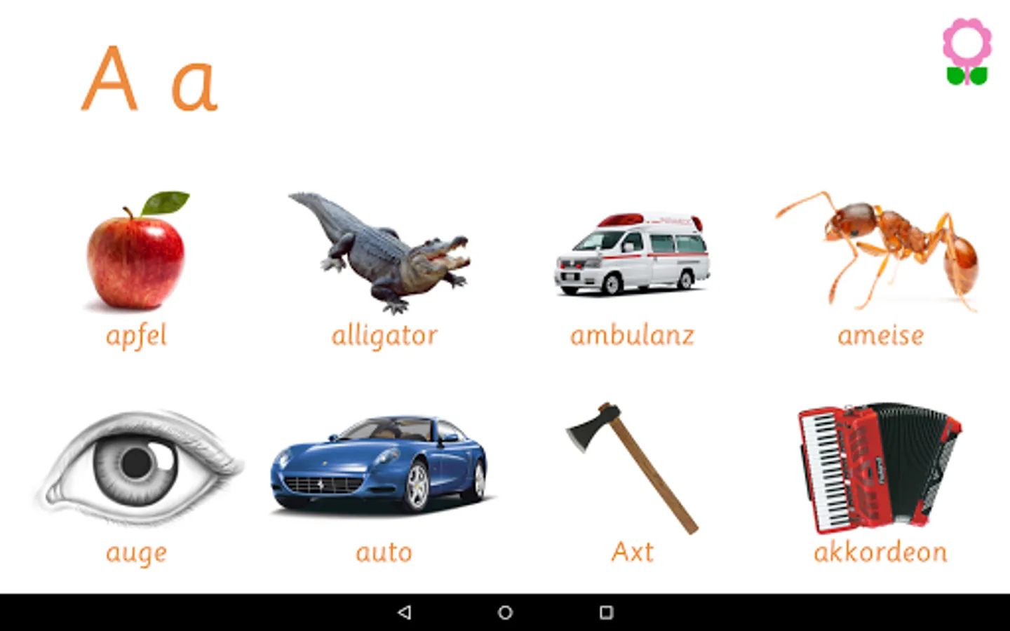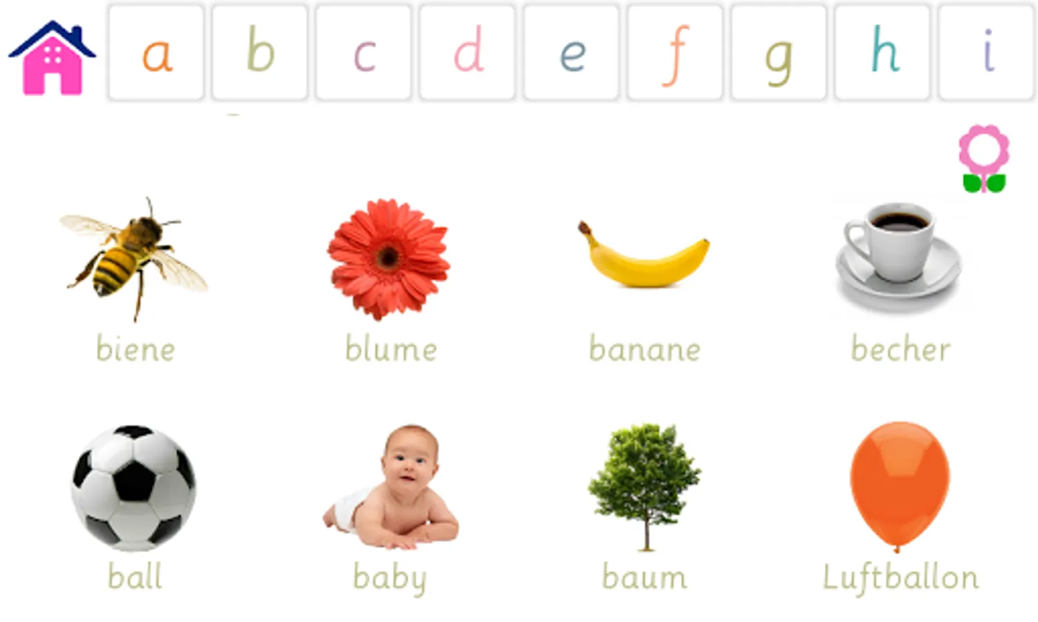 The alphabet and vocabulary-book is a creative and colorful app for kids that presents all of the letters of the German alphabet. It enables both the identification and designation as well as the pronunciation of objects. An important and instructive part for beginners is that the learners are able to identify case-sensitive. Therefore this app has more than one word for each letter, as in any other app available in this area.