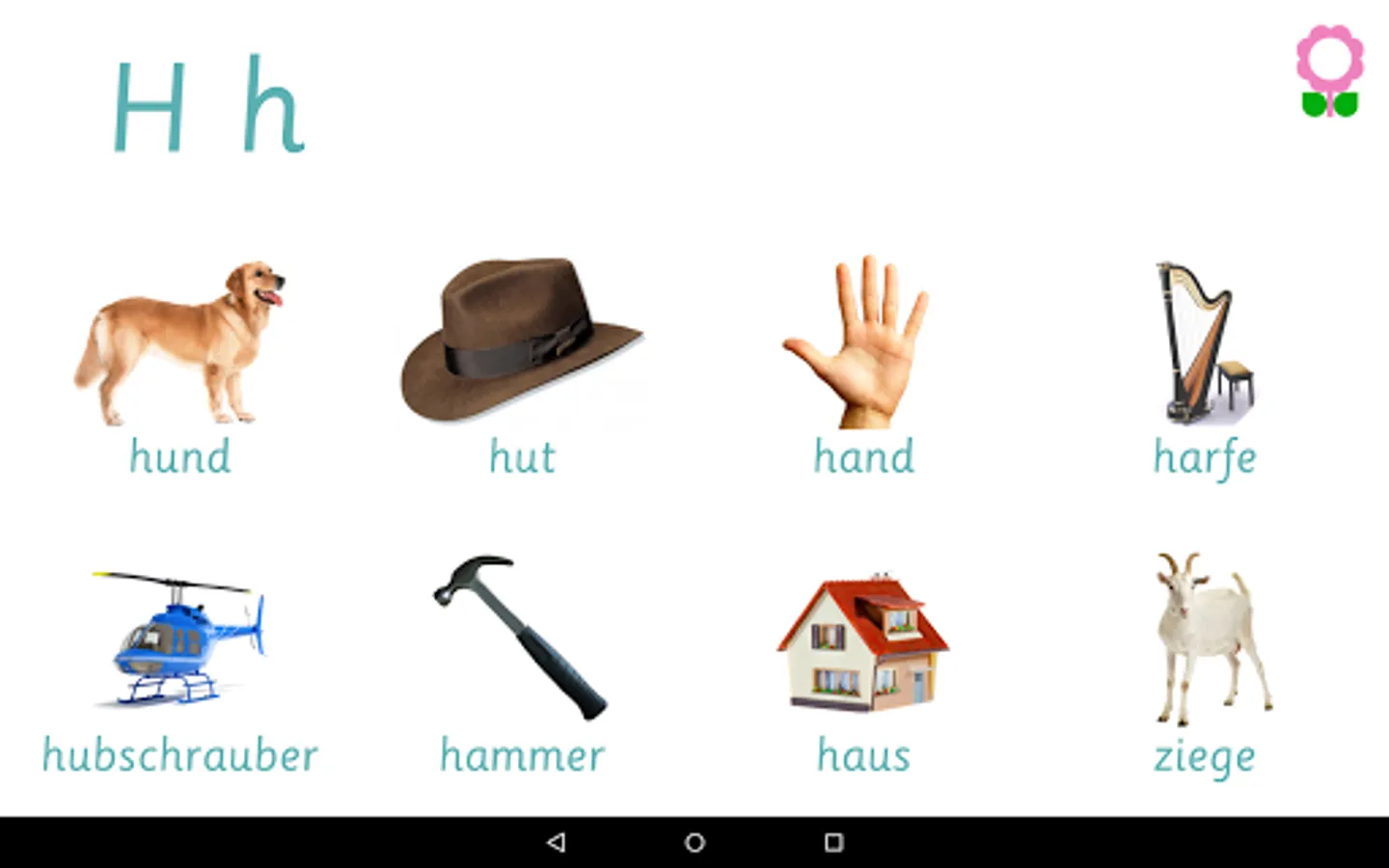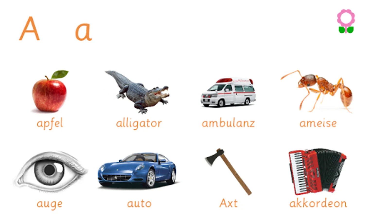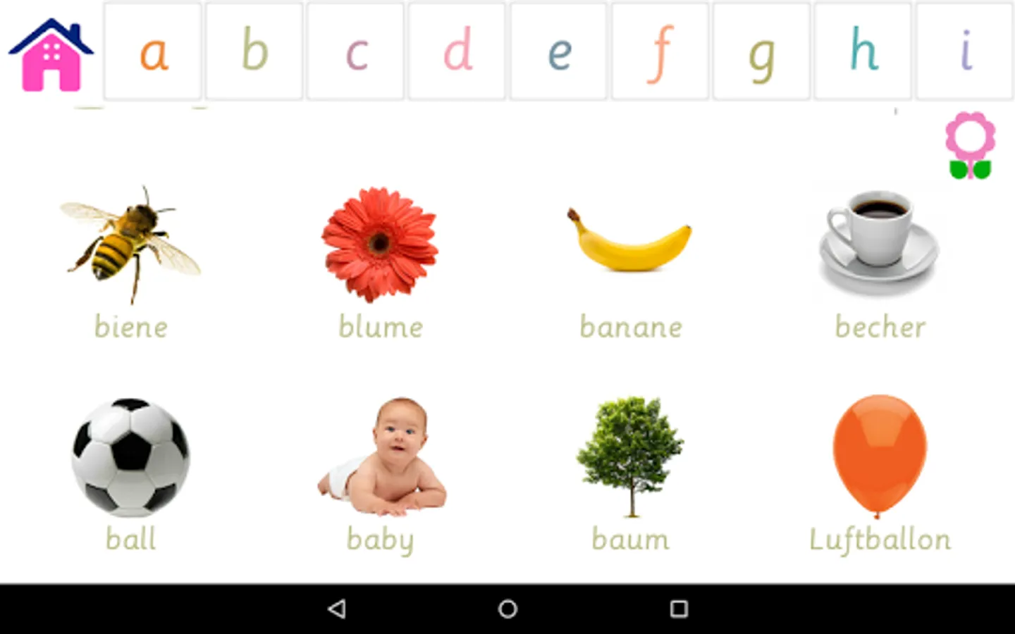 The alphabet and vocabulary-book is a creative and colorful app for kids that presents all of the letters of the German alphabet. It enables both the identification and designation as well as the pronunciation of objects. An important and instructive part for beginners is that the learners are able to identify case-sensitive. Therefore this app has more than one word for each letter, as in any other app available in this area.