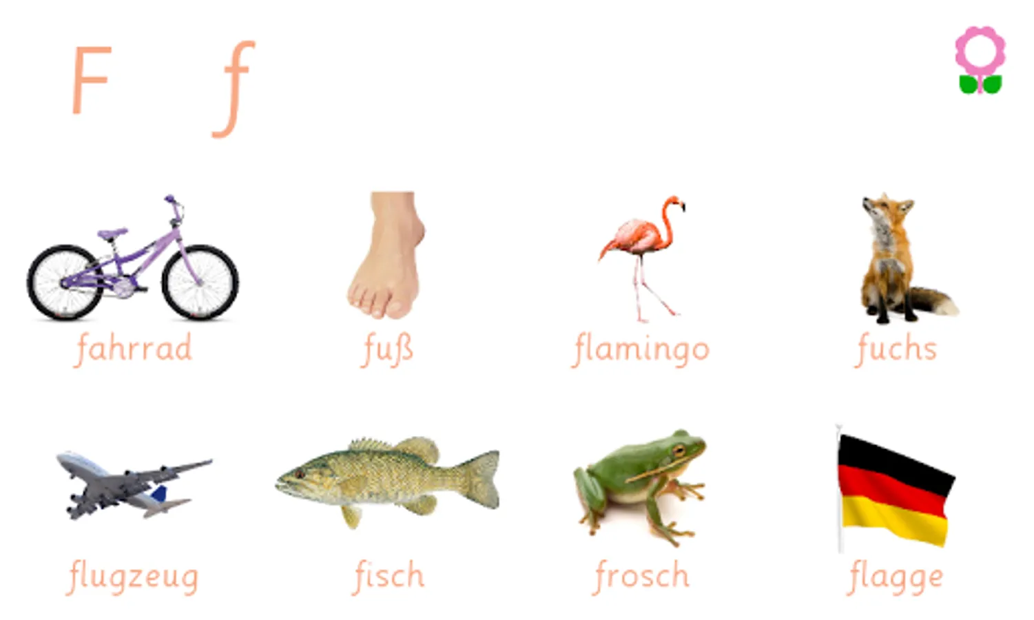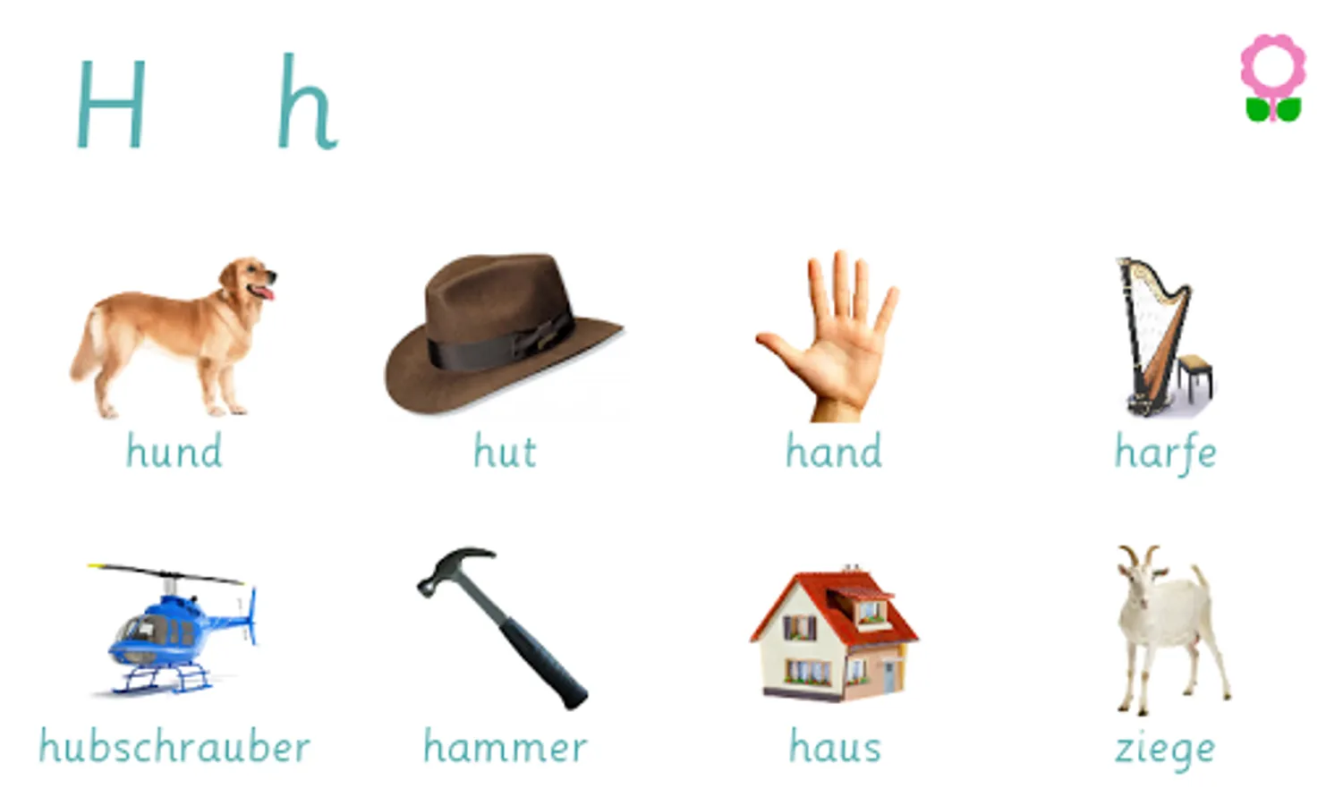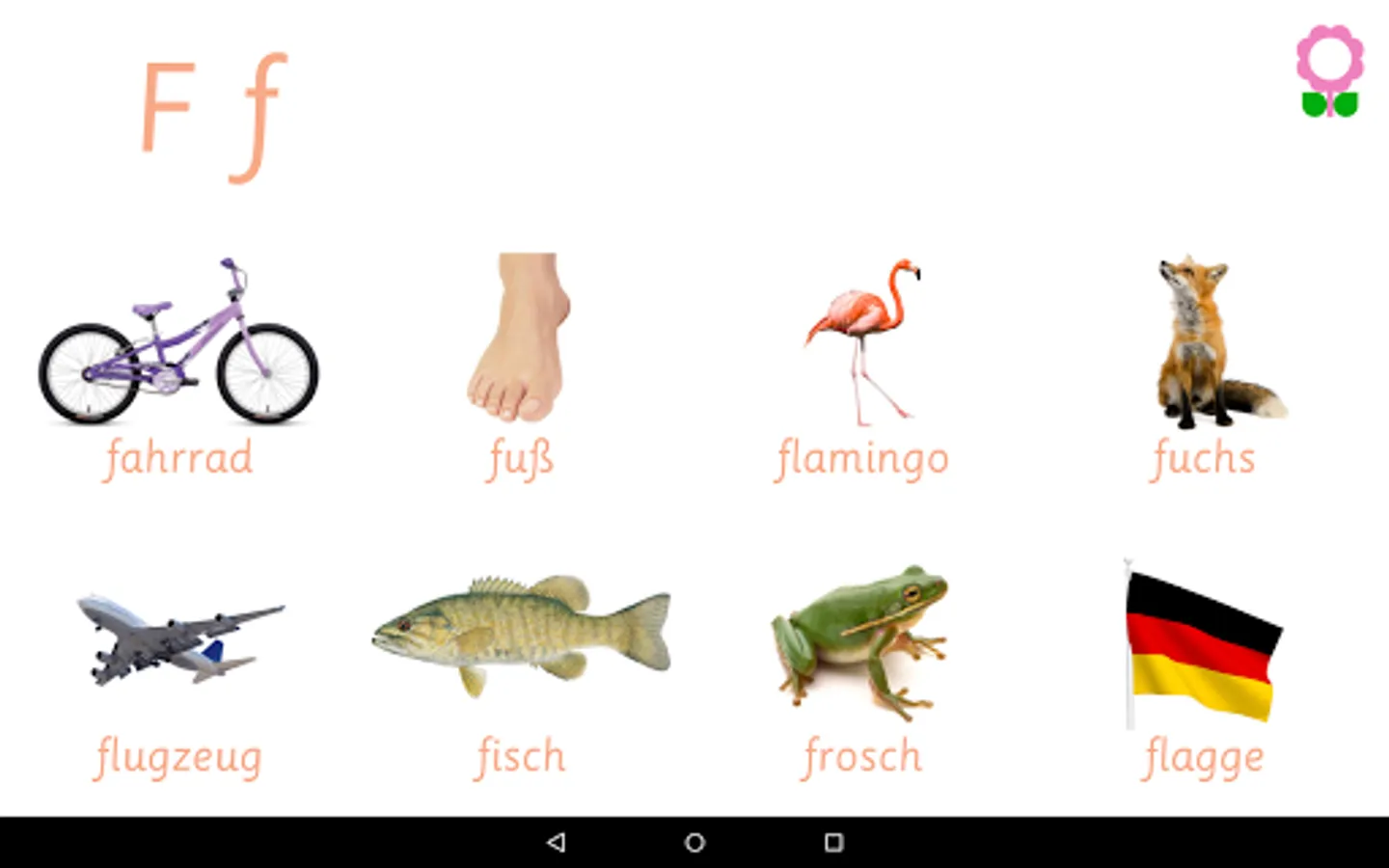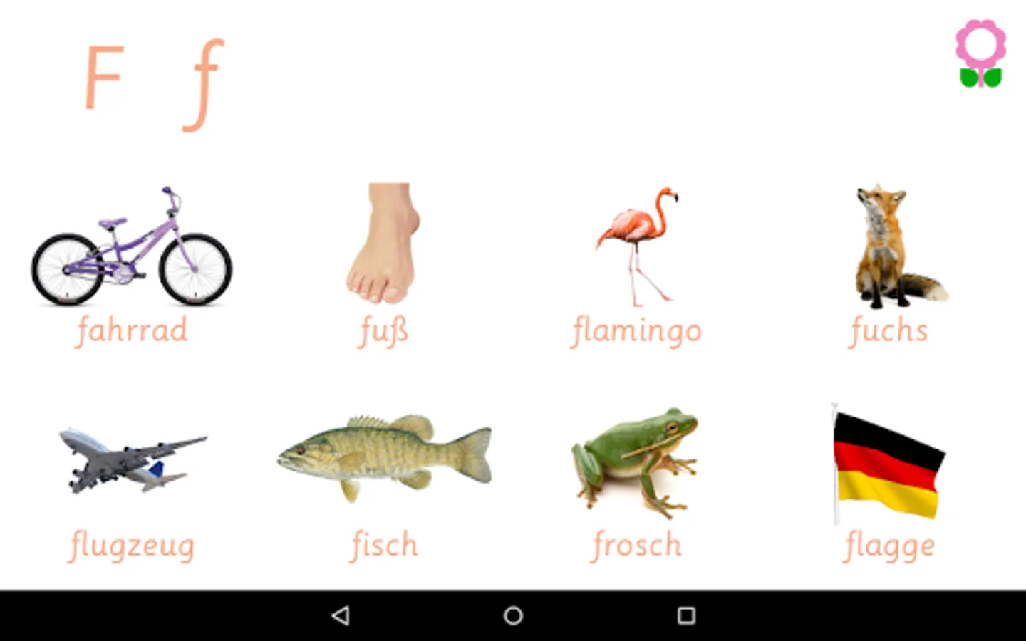 The alphabet and vocabulary-book is a creative and colorful app for kids that presents all of the letters of the German alphabet. It enables both the identification and designation as well as the pronunciation of objects. An important and instructive part for beginners is that the learners are able to identify case-sensitive. Therefore this app has more than one word for each letter, as in any other app available in this area.