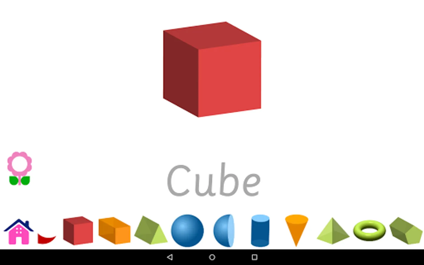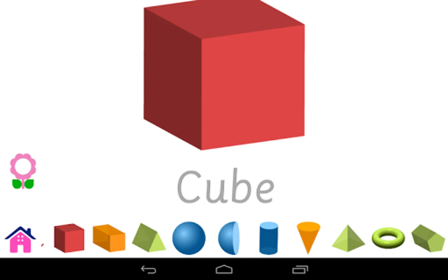 This app contains Basic 2D geometry shapes (Square, Circle Triangle) and Basic 3D geometry shapes (Cube, Cylinder, Cone) for 1.5 − 3 year kids.