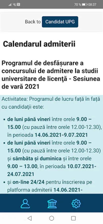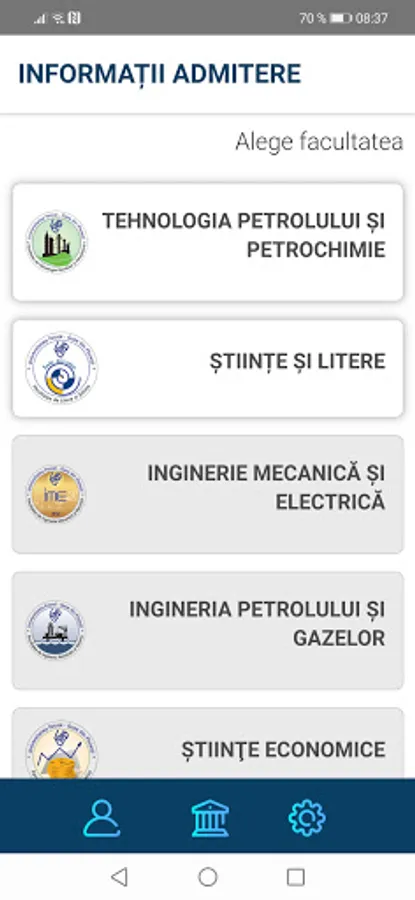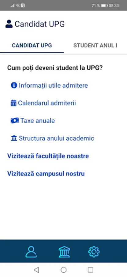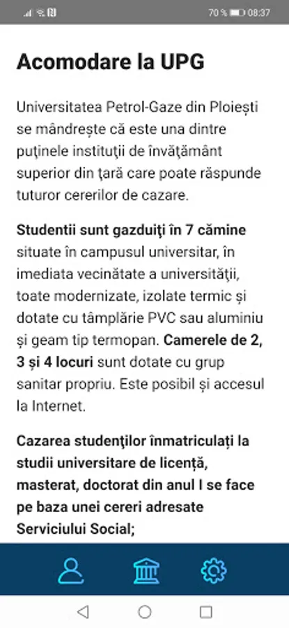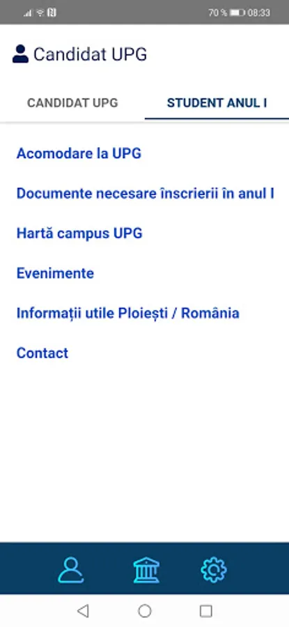 The Student UPG-Ploieşti mobile application is intended to be a useful tool for both potential Romanian or foreign candidates, as well as university students. With the help of the application, the candidates have access to general information regarding the admission, the fees, the structure of the academic year, but they can also make a short incursion in the university campus or they can access the websites of the faculties within the university.