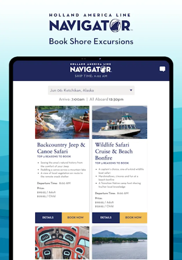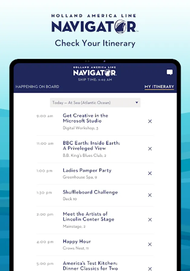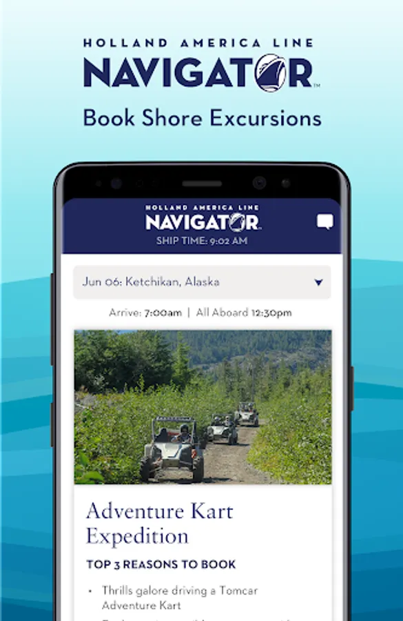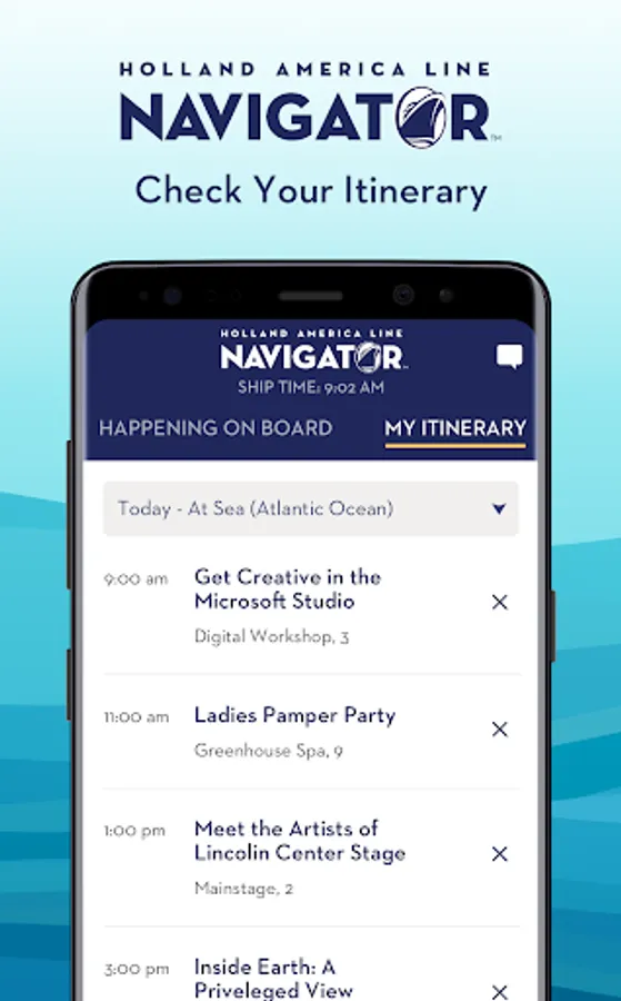 Use the Holland America Line Navigator app when in port to check your daily itinerary, book shore excursions and make dining reservations. So, you can just relax and enjoy your time ashore, knowing you’ll never miss an important event during your cruise.