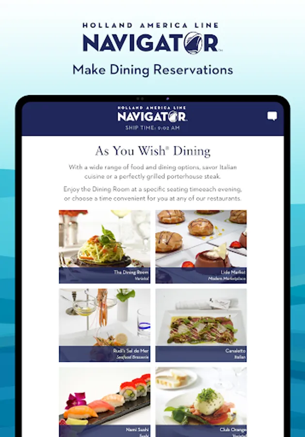 Once on board, connect to the ship’s WiFi to view dining menus, spa services, shore excursions, chat with other guests and more at no additional charge. (An onboard Internet purchase is NOT required to use the Navigator app.)