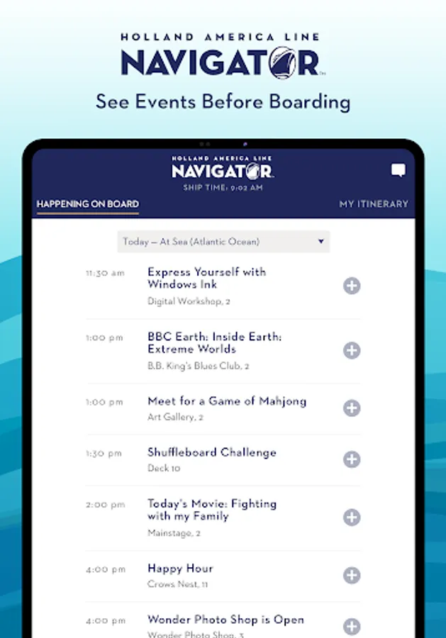 Get the latest on events, activities, and the evening dress code even before you board. See planned events and add them to your itinerary.