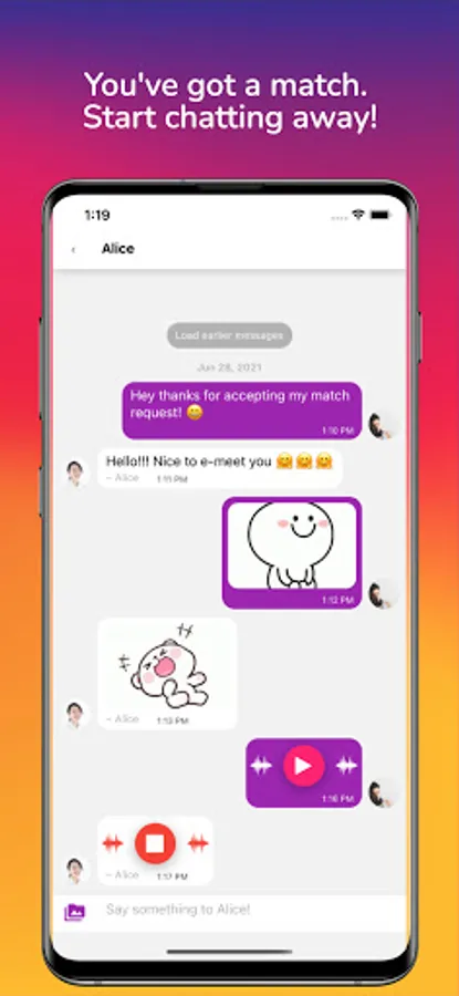 5. You've got a match! Share voice notes, gifs, cute emojis, and messages using our live chat feature.