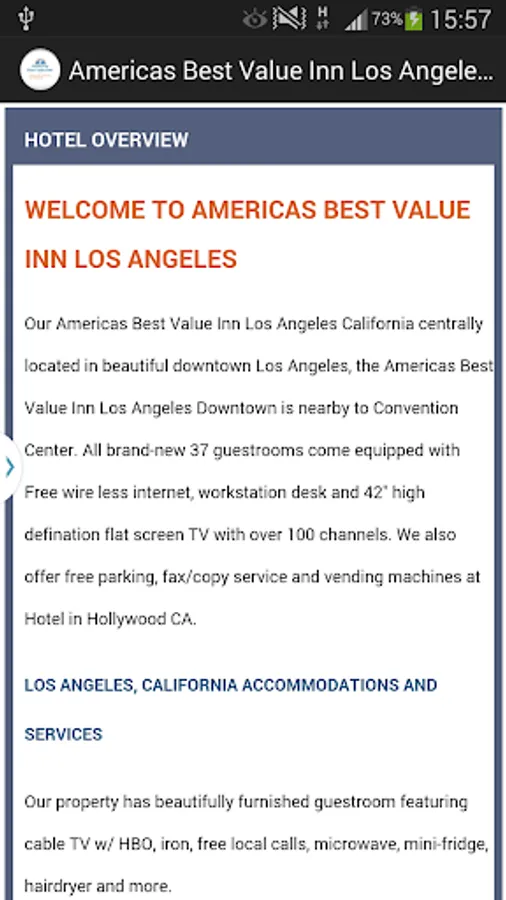 Book Americas Best Value Inn Los Angeles CA quicker and easier than ever before. With the hotel’s app powered by BingoTravel Apps, connecting with this property directly and simply has never been more convenient. Do everything you need on your smart phone! This single property app lets you take a look at hotel features and amenities and glimpse useful photos -- anytime you want. And of course, you can book directly with this powerful application. Even better, do things around the clock without waiting on hold or dealing with a call center. To connect with this hotel now, download this app.